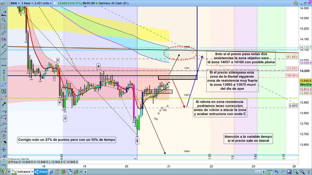 En gráfico de 1 hora del dax40, vemos como el recorrido más probable es finalizar el recorrido alcista en la zona entre los 14056 y los 14100. Sin embargo, hay dos zonas complicadas como resistencia, la primera, la Genial de gráfico de 1 hora, parece que ya la superamos ayer tarde noche, la otra que aún está pendiente de superar, es la que estuvo actuando como resistencia el pasado lunes, la zona 13960 a 13975.