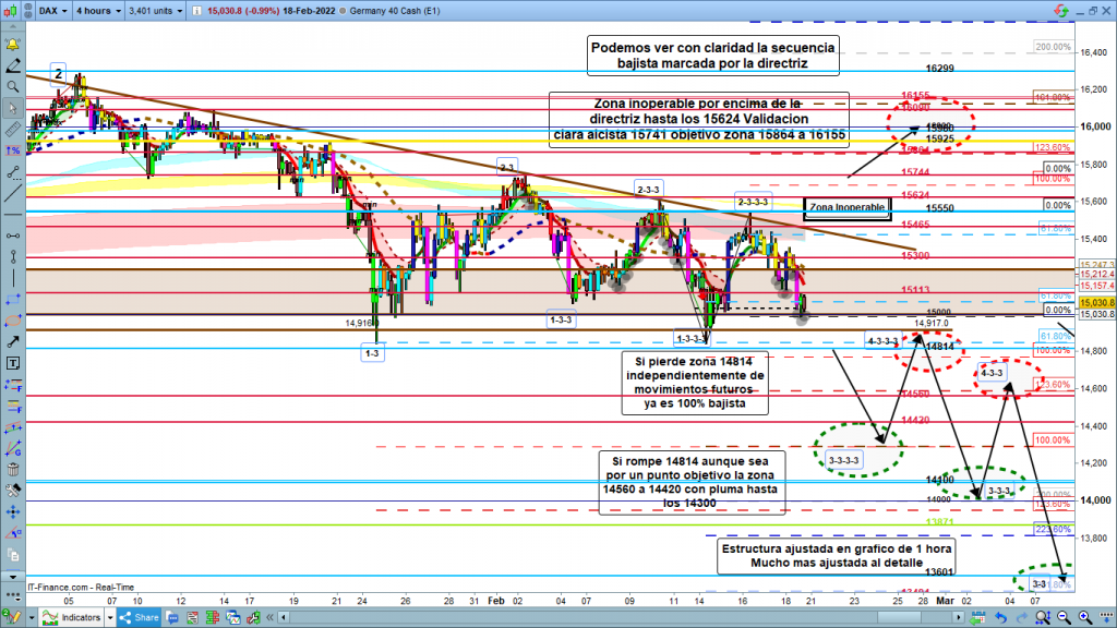 Por la parte inferior la estructura es mucho más clara, Se ha dibujado desde onda 2, una serie de ondas de 3 extendidas, todas en su primera fase o sea ondas 1 y 2. Onda 1-3 y onda 2-3, onda 1-3-3 y onda 2-3-3, onda 1-3-3-3 y onda 2-3-3-3, y parece que ya estamos en clara estructura también compuesta por 5 ondas de la onda 3-3-3-3. Dibujo de las zonas de impulso y corrección, con elipses, correspondiendo la amplitud de las elipses a las zonas a alcanzar en cada onda, dependiendo de la fuerza o falta de ella en el momento de cada movimiento. Así podemos ver las zonas de proyección, de los impulsos y final de onda 3-3-3-3, onda correctiva 4-3-3-3, onda 5-3-3-3, para acabar onda 3-3-3, subsiguiente corrección onda 4-3-3, siguiente impulso (siempre con estructuras de 5 ondas en los impulsos y 3 en las correcciones), de 5-3-3, para acabar la onda 3-3, etc. Toda esta estructura dependerá en su validación con un movimiento por debajo de los 14814 sin ninguna duda, aunque yo haga meses que lo vengo anunciando, ahora todo el mundo coincide que la frontera de los 14800, validaría con claridad el amplio movimiento bajista y final del rango actual. Esto sin ninguna duda aceleraría los movimientos de caída, al coincidir muchos inversores en cuál es el punto clave técnico para la mayoría, aunque él personalmente siga pensando que es alcista seguro que venderá. Esto provoca las caídas importantes y el frenazo de las mismas en las zonas, soporte conocidas, benditas cotas históricas.