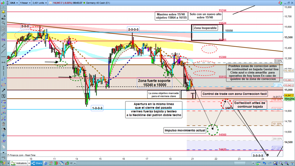 En el análisis del fin de semana, con los gráficos de grandes tempos, vemos una clara fuerza bajista bastante sólida. En gráfico mensual la zona 14900, en gráficos semanal y diario mucho más claro el escenario. La zona 14838 y sobre todo la cota histórica de segundo grado, o sea importante, en 14814, ahí estará la clave. Aquí en este flash, justo después de la apertura semanal a las 00 h, detalle de la apertura, así como la proyección más posible a corto plazo, para la operativa de hoy lunes.