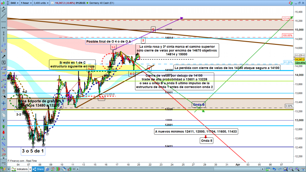 En el caso de que el precio pierda y confirme perdida de la zona de la Genial line de H1, en 14350. ataque y momento de la verdad a la zona de los 14100 de nuevo. En esta zona, la clave de la futura evolución. Cierre de velas por debajo de los 14100, objetivo de alta o muy alta probabilidad, hasta la zona de los 13601 a los 13228, atención también a la zona de los 13480. De nuevo, si se da este escenario, muy importante la hora y, por tanto, la volatilidad, o la fuerza mantenida del movimiento, ya que, podríamos tener movimiento consolidado o de solo pluma hasta los 12881. En el caso de cierre de velas por debajo de 12881, confirmación de la opción de estar en onda 5 del último impulso de la onda 1. Zonas dependiendo fuerza 12411, 12000, 11704, 11600, 11433.