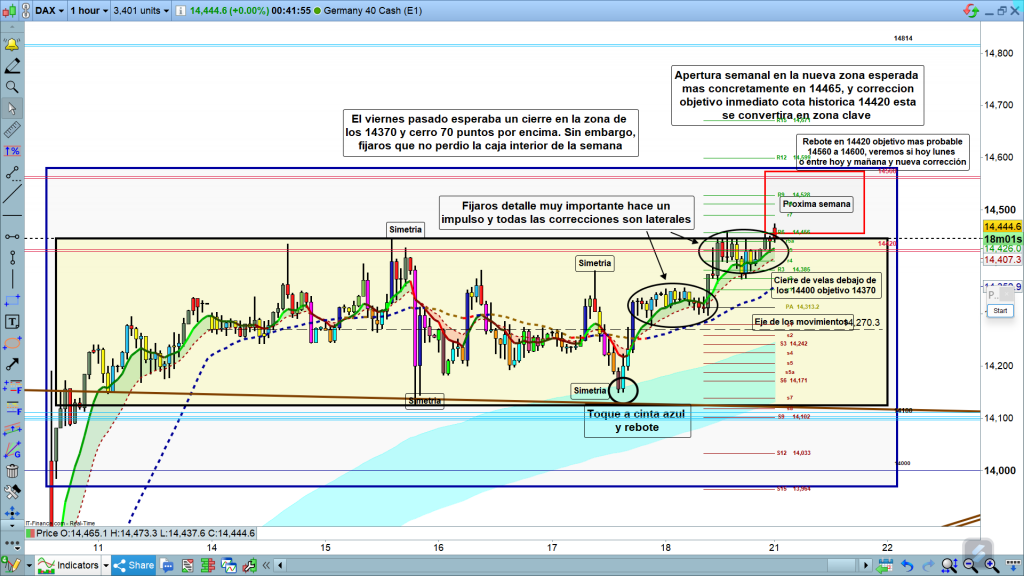 Lo más probable, es que en alguna de estas 3 zonas, 14420, 14400 o 14370, tengamos rebote e inicio de nuevo impulso alcista. Veremos si el objetivo en la zona de los 14560 a 14600, se alcanza hoy lunes o mañana martes, a partir de alcanzar este objetivo, de nuevo corrección.
