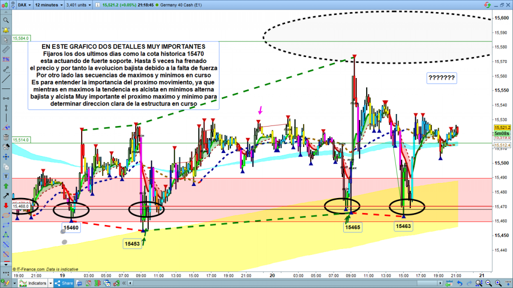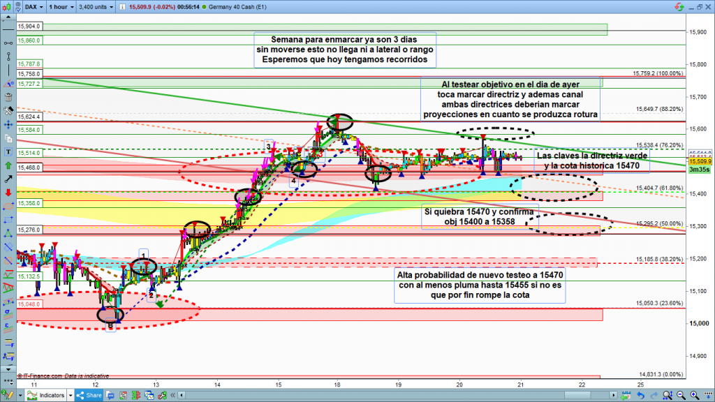 Resumiendo, las claves la directriz verde y la cota histórica del 15470. Con rotura de la directriz, que esta de media en los 15540, de segundas ataque a la zona objetivo superior de ayer entre los 15570 a 15580, si supera esta zona ataque a los 15624, mucha atención a un nuevo alto por encima de 15635, que muy probablemente nos llevaría a la zona 15730 a 15760. Por la parte inferior la cota histórica actuando de fuerte soporte en 15470. Mientras vaya rebotando en la cota, solo plumas de 10 o 15 puntos, no habrá evolución bajista. Solo con su quiebre y confirmación de quiebre, objetivo los 15400 a 15358 y posible testeo a directriz roja dependiendo de la hora en una zona u otra. Muchísima suerte y muy buenos trades.