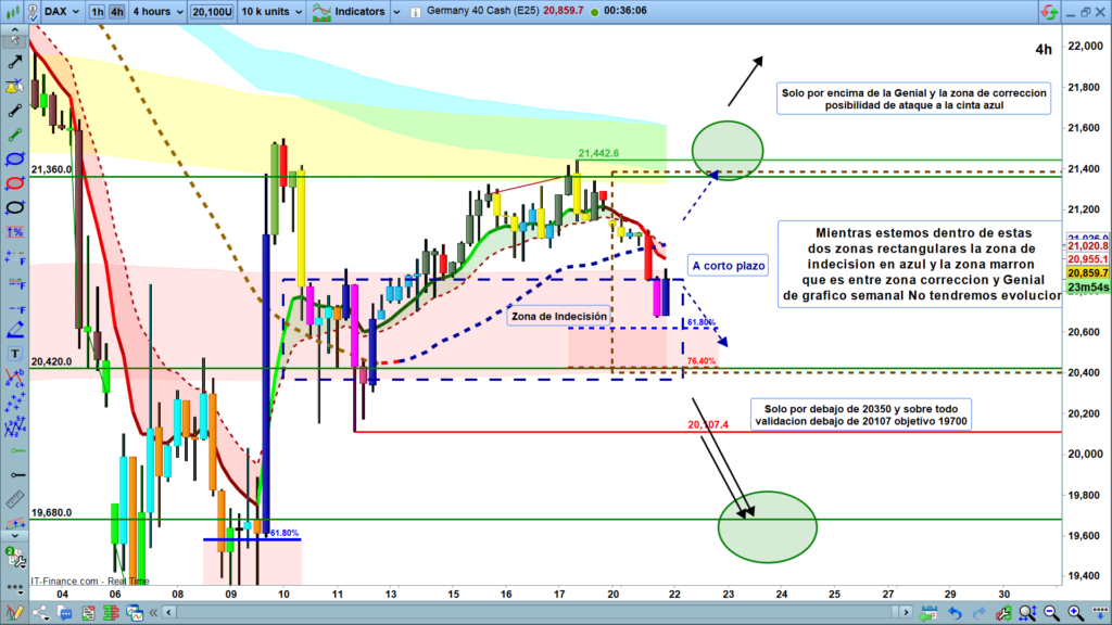 La situación y el análisis, es una posible continuación del de ayer. Hoy, mientras estemos por debajo de la zona de corrección y de la Genial line, los movimientos más probables son hacia los 20500. Solo por encima de la zona de corrección y Genial line, en principio parece una opción poco probable si no tenemos ningún catalizador externo, pero si tenemos quiebre y confirmación de quiebre la zona objetivo será la cinta azul, en los 21500, fijaros que son casi 1000 puntos por encima de donde estamos ahora. Muy poco probable sin catalizador.