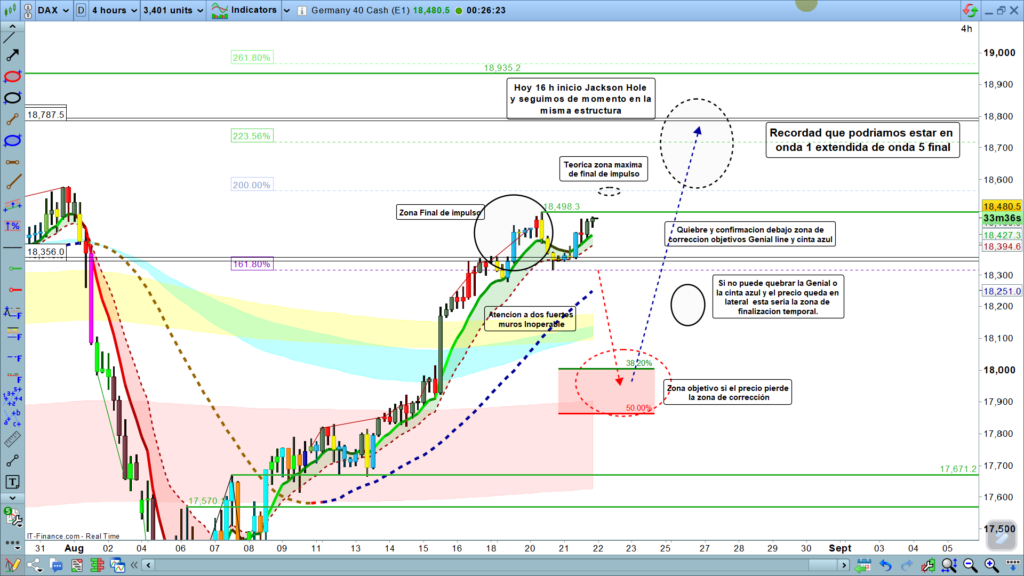 Análisis diario Dax, tipo flash corto, lectura de 2 a 4 minutos, con las claves del día. Ondas de Elliot, estructuras de precio, zonas clave y objetivos.