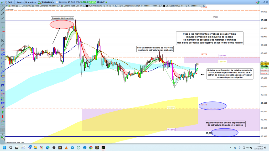 Ayer, el precio siguió un deambular claramente errático típico de una situación de corrección, apertura diaria en la zona de los, 16625, para acabar cerrando el día en la zona de los, 16730, día con 100 puntos alcistas dentro de una estructura correctiva bajista, con objetivo claramente trazado.