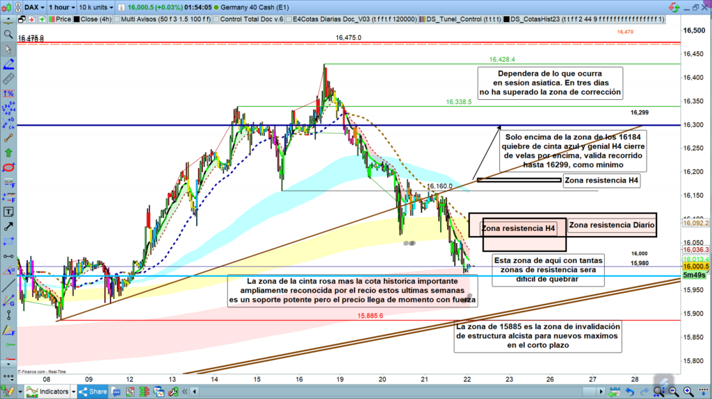 Lo más normal, sería que el precio en esta zona finalizara el movimiento actual y rebotara. Pero mucha atención porque tres días seguidos de rally fuertemente bajista siempre mueven las estructuras dinámicas del mercado, la zona entre los, 16030 y los 16110, es una zona con muy fuertes resistencias, en esta misma zona coinciden de zonas de resistencia dinámicas importantes de gráficos de una hora, de cuatro horas, e incluso de gráfico diario. Lo cual significa que si el precio rebota en la zona de la cota histórica de los,15980, hasta que supere la zona claramente de los,16110, no va a tener camino libre para correr.