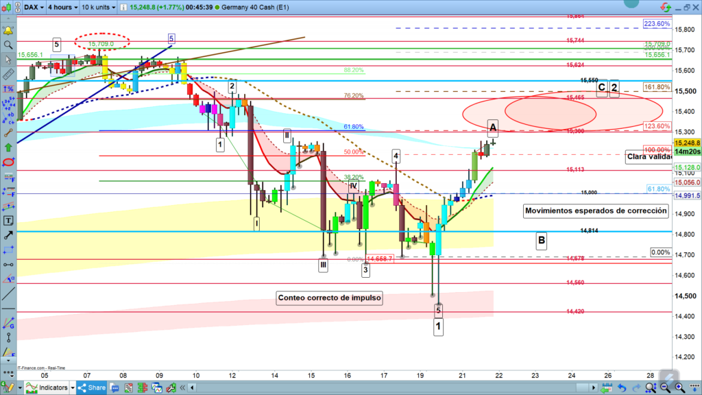 La verdad es que cuesta, mucho proyectar el próximo movimiento, una onda B suele estar formada por 3 movimientos, impulso bajista (importante, el primero en las ondas B), pequeña corrección alcista, y un segundo impulso que nombramos como onda c, y que debe estar formado por 5 ondas, o sea es una estructura 3-3-5. Vistas las proporciones de la subida desde los 14458, hasta la zona de los 15260 de momento, se hace complicado marcar zona objetivo, las ondas B suelen corregir entre el 38,2% y el 50% del movimiento anterior, a veces con pluma puede llegar hasta el 61,8%. Sin embargo, en momentos de tensión en los mercados, y a veces fuerza mantenida o volatilidad, una onda B dependiendo del ángulo de bajada puede llegar hasta el 80%. Por tanto, muy complicado.