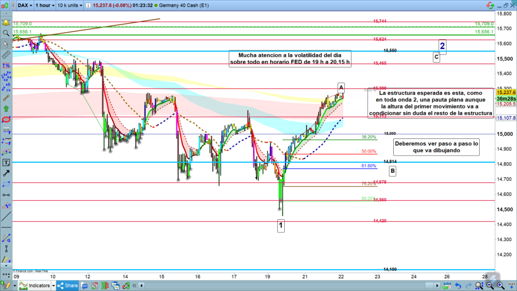 Ayer día alcista después del lunes, también muy claramente alcista, lo que llevo el precio hasta la zona de los, 15260. Desde la zona de los 15113, esperábamos ya la corrección de onda B. Esto es un problema, cuando pensamos que un movimiento ya puede estar finalizado, nuestra mente se obceca, y no sigue su sistema, sino que se queda esperando entrada en dirección contraria que no llega y se pierde el día y la oportunidad de rentabilidad. Tenedlo en cuenta y si vuestro sistema de Control y seguimiento no os indica lo contrario, dejad que sea vuestro sistema el que controle la operativa.