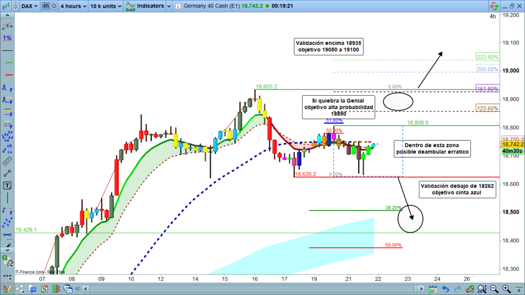 Mientras el precio este manteniendo el pequeño rango lateral, atrapado entre los, 18800 y los, 18626, no tenemos posibilidad de operativa, al no tener recorridos claros y definidos. Deambular posible, muy errático como los dos últimos días. Muchísima suerte y muy buenos trades.