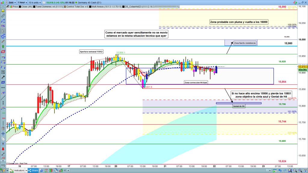 Ayer, apertura del día en la zona de los, 15931, todo el día en un mini rango completamente inoperable, para finalizar la sesión en la zona de los 15910. Día completamente neutro, sin ningún movimiento ni alcista ni bajista mínimamente significativo. La verdad es que fue un día sin ningún tipo de historia, cuesta recordar un día con tan pocos movimientos.