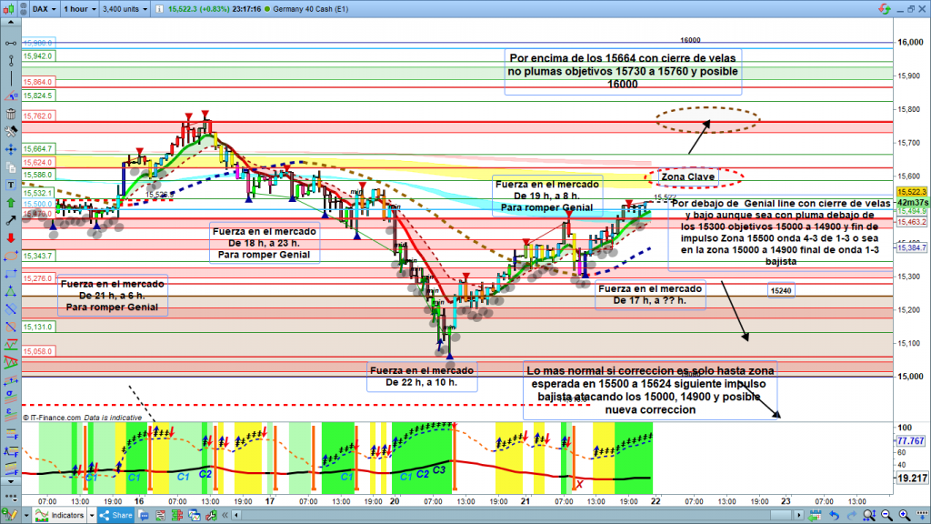 Si os fijáis parece quiebre por arriba, de la cinta azul, por tanto, próximo objetivo, posiblemente en sesión asiática, hasta zona 15565 a 15624. Si no la ha alcanzado en sesión asiática, y seguimos por encima de los 15500. Muy importantes las horas de pre apertura de las 8 h, y la apertura de Frankfurt a las 9 h. La zona clave del día es la zona comentada entre los 15565 y los 15624. Solo un cierre de velas por encima de los 15624, o sobre todo de los 15664, para más seguridad. tendríamos rally hasta 15730 a 15760 de nuevo.