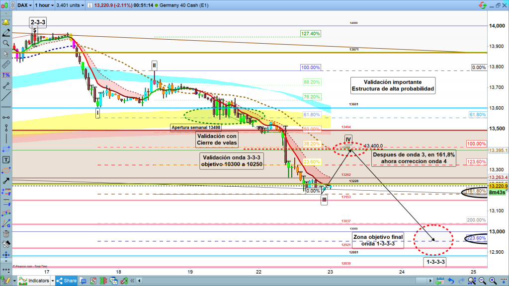 Mucha atención a la sesión asiática y como cada día, en preapertura y apertura del parquet de Frankfurt, deberíamos haber finalizado el impulso actual e incluso la onda 4, de corrección esperada de nuevo en la zona de los 13400. Ojo digo zona, no necesariamente deberá llegar hasta los, 13400, (38,2% de la corrección) o quizás la sobrepasa. (hasta la zona del 50%). Acabada la corrección, nuevo impulso bajista para acabar la onda 1-3-3-3, en la zona entre los 13037 y los 12881. Muchísima suerte y muy buenos trades.