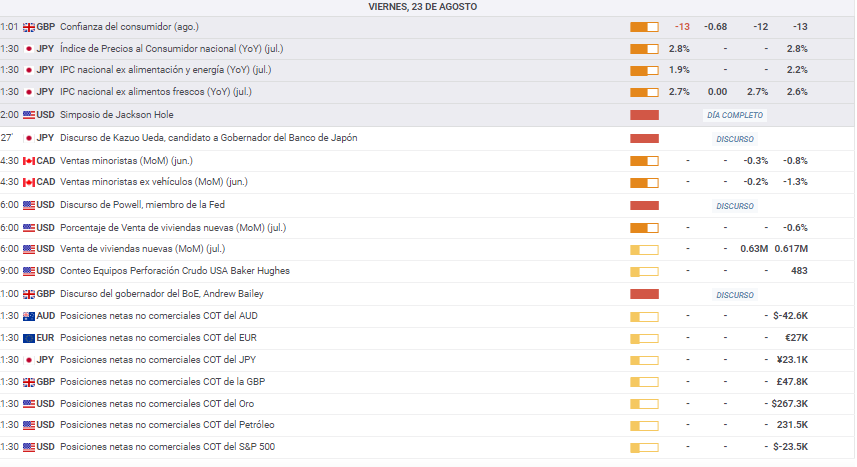 Publicado viernes 23 de agosto de 2024, a las 00 h UTC. Las horas del Calendario Económico, son UTC+2.