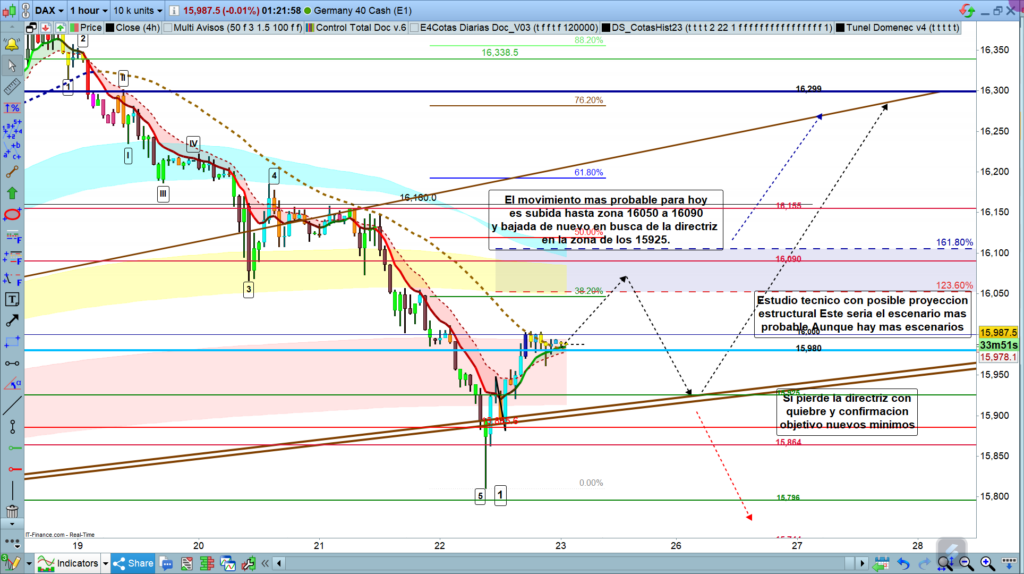 El movimiento estructural más probable, es que el precio siga subiendo como mínimo hasta la zona de los, 16050 a la cota histórica de los,16090. Y posiblemente en esta zona tengamos una situación de rebote. Si este rebote se produce y perdemos de nuevo la zona de corrección de gráfico de una hora, el objetivo más probable es bajar hasta la zona de la directriz. La directriz tanto para el día de mañana como para el próximo lunes coincide con la cota histórica de corto plazo en los, 15925.