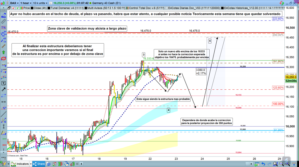 Todo depende de la zona clave, 16475, tanto si la válida en el movimiento actual, como si la validación se produce después de haber hecho esta importante corrección hasta la zona de los 15465, y vuelve a subir en nuevo impulso. Intento explicarlo mejor si tenemos un alto encima de los 16475, en los próximos días al finalizar la estructura actual, ya sabremos que estamos con onda extendida dentro de onda extendida y que el objetivo final por arriba será alto y dentro de bastantes meses.