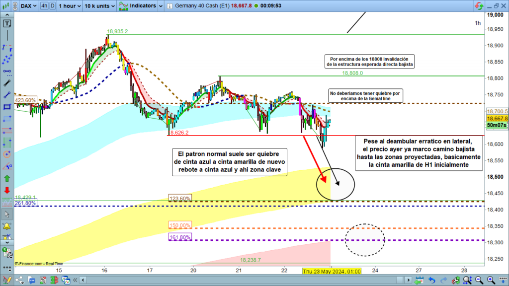 Es importante tener en cuenta que el precio no debe romper hacia arriba la zona de la Genial de H1 en ningún momento. Cada corrección al alza debería considerarse como una oportunidad para ingresar en un nuevo tramo del recorrido bajista. En caso de que el precio rompiera y confirmara por encima de la línea genial line, es probable que se dirija hacia los 18,808 puntos, invalidando inicialmente la estructura inicial prevista y posiblemente dando lugar a un segundo movimiento correctivo alcista dentro de una tendencia bajista más amplia.