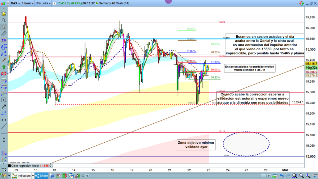 Si el precio durante asiática cierra velas de 1 hora validando quiebre de la cinta azul, por arriba, el objetivo más probable, tanto en la misma sesión asiática, como en las velas de las 7 h o de las 8 h en preapertura, será la cota histórica de los 15465. Atención a la posible fuerza, y sobre todo a los horarios, si hay volatilidad a las 11 h, con la publicación de los datos de Índice de Precios al Consumo, ya que podríamos tener una pluma importante por arriba de la cota histórica, posible zona entre 15480 y los 15500.