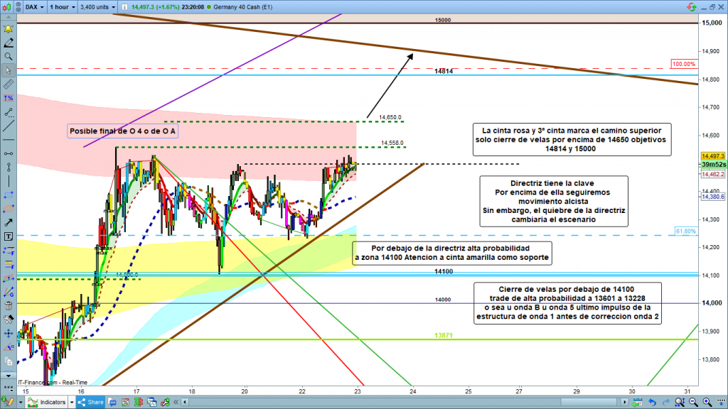 Las claves del día, por arriba 14558, y después validación clara con cierre de velas por encima de 14650. Por abajo los 14380, directriz en las horas de alta volatilidad del día, preapertura a las 8 h y apertura del parquet de Frankfurt, a las 9 h. Y sobre todo la validación importante para grandes recorridos con la perdida de los 14100.