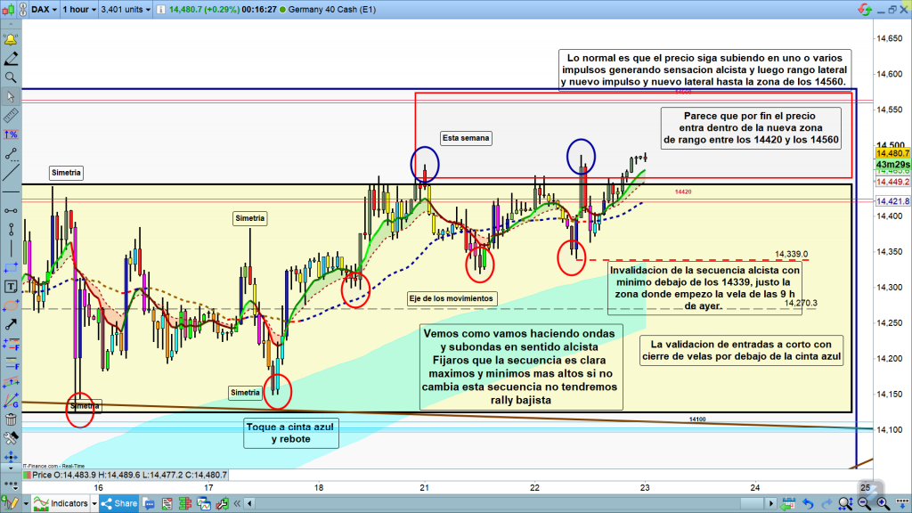 Si recordáis este segundo rectángulo de color rojo, ya lo había dibujado la semana pasada, como posible nuevo rango para la operativa de esta semana, Hemos ido con un poco de retraso, pero hoy martes, próximos ya al cierre del día, parece que está consolidando en el nuevo nivel. Si el precio llega hasta los, 14500 a 14510 puntos, posiblemente ya consolidará dentro de este nuevo nivel. Recordemos entre los 14420 y los 14560.