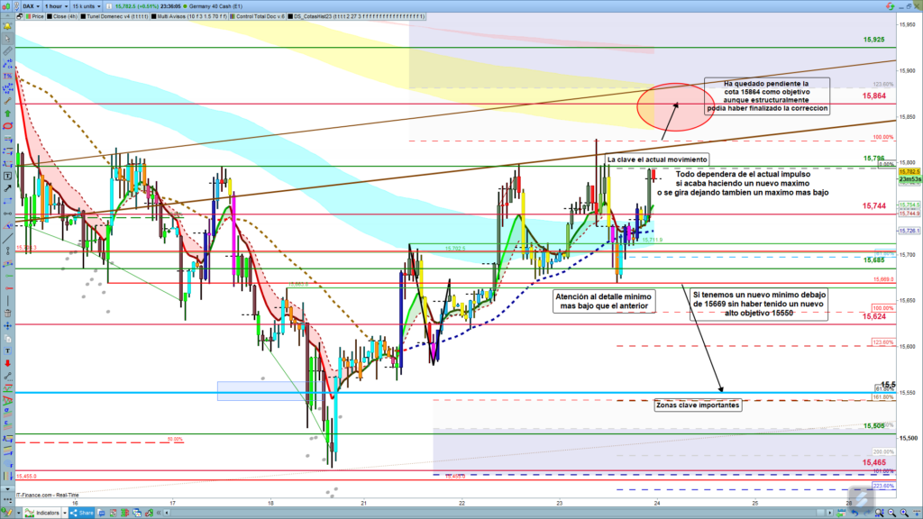 Solo en el caso de que el movimiento actual, no realizara un nuevo alto por encima de los,15825, y tuviéramos un impulso bajista, en el caso de tener un mínimo por debajo de los, 15669, tendríamos una clara validación estructural, el precio hasta la zona de los, 15550, de la cota histórica importante protagonista este año 2023.