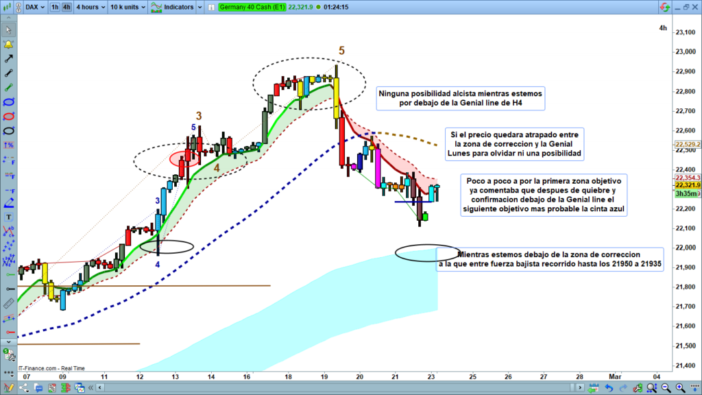 El DAX muestra una estructura correctiva clara, con posibilidad de caída hasta 21,950 – 21,935 si no logra recuperar la zona de corrección. La clave estará en la apertura del lunes y la reacción del precio en torno a la Genial Line.