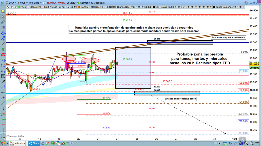 En gráfico de una hora del Dax40, nada nuevo después de la apertura semanal, que ha sido en la zona de los, 16177. Sigo pensando que hasta el miércoles a las 20 h, muy posiblemente sigamos con la tónica de días casi neutrales y con pocos recorridos y erráticos complicados de operar, dentro de la zona marcada con el rectángulo.