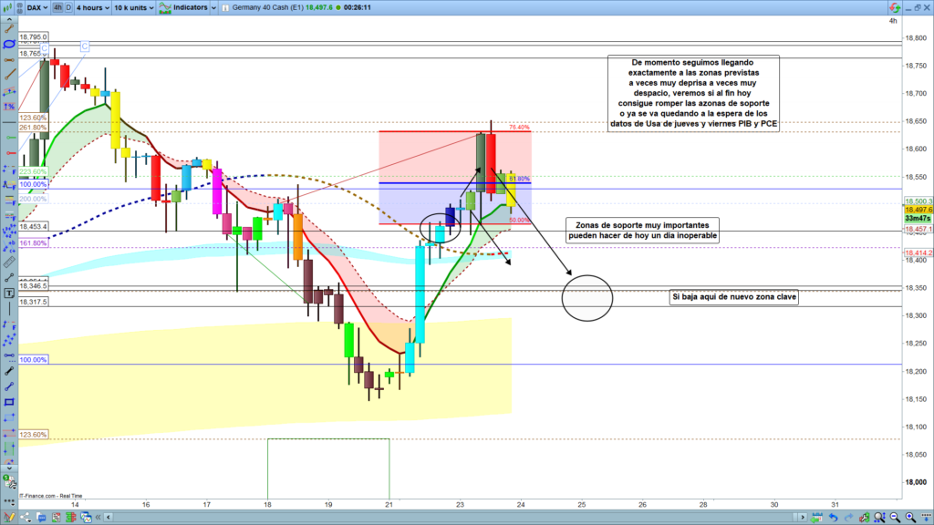 Ayer, después de dos jornadas y media de movimientos inesperados para un mes de julio, tuvimos por fin un día completamente neutral. Inicio del día en la zona de los, 18495, para acabar cerrando el día en la zona de los, 18490, como podéis ver todo un día para acabar exactamente en el mismo sitio donde había empezado la jornada. Durante el transcurso del día, el precio llegó hasta la zona ya marcada de los, 18630, zona máxima esperada por la parte superior.
