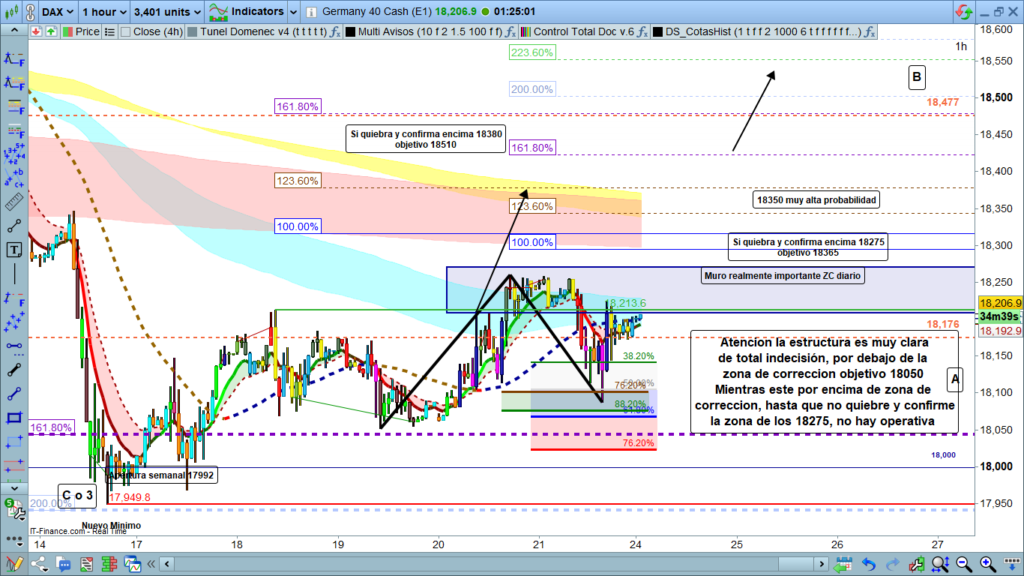 Análisis diario Dax, tipo flash corto, lectura de 2 a 4 minutos, con las claves del día. Ondas de Elliot, estructuras de precio, zonas clave y objetivos.