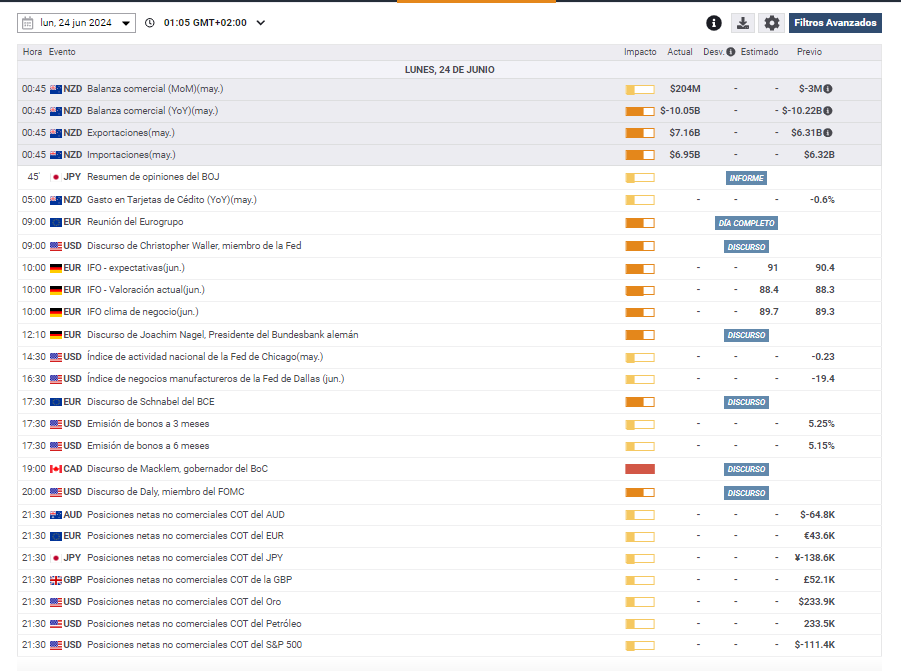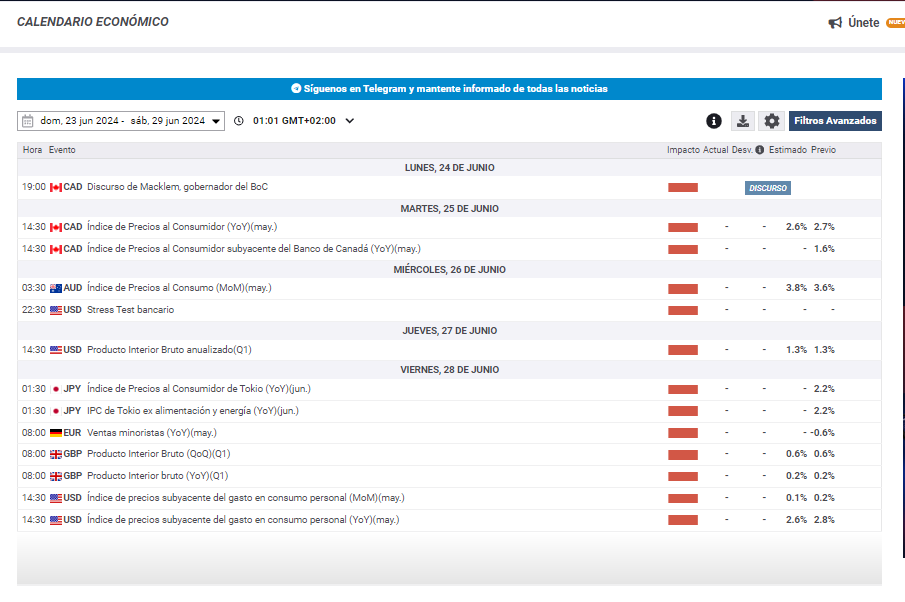 Publicado lunes 24 de junio de 2024, a las 00 h UTC. Las horas del Calendario Económico, son UTC+2.