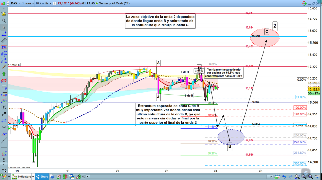 Ayer al final hizo lo esperado, pero como siempre mucho más lento que lo esperábamos todos/as. Estuvo casi todo el día hasta lel cierre del parquet de Frankfurt, a las 17,34 h, para completar la onda b, de la onda B en curso. Ya después de esta hora, sobre todo a partir de la vela de las 18 h completo la onda 1 y después la onda 2 de la onda C de B, casi con el cierre del día. Eso que estuvo todo el día en lateral, ligeramente alcista, por encima de los 15113 e incluso la parte superior final de la onda b de B, hasta la zona de los, 15246. y posterior bajada hasta la zona de los 15010, en el primer movimiento de la onda c de B.