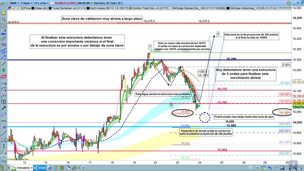 Ayer, pese a tener todo el día unos movimientos muy lentos y erráticos, partir del cierre de Frankfurt, tuvimos el movimiento más importante para llegar a la zona objetivo marcada. Recordemos que era la zona entre los,16120 y los, 16090. Alcanzados los dos objetivos de los take profits. Al cierre de la jornada el precio está en la zona de los, 16090. Movimiento esperado, y a partir del mínimo alcanzado, si no hay sorpresas, es donde empezará el que debería de ser el último impulso de esta estructura actual. Para que no haya malos entendidos, me refiero a la estructura que empezó en los catorce mil cuatrocientos cincuenta y ocho. Y que en estos momentos no sabemos todavía, si puede ser final de estructura o tan solo de una onda, 1-3-3, fase inicial de un gran impulso alcista.
