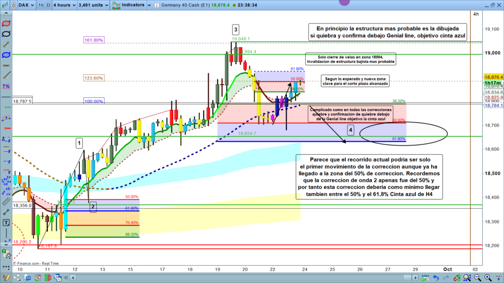 La otra opción es que no tengamos rebote, que el precio no quiebre la Genial line, sino que siga recorrido alcista, por encima claramente de la zona alcanzada ayer. Con cierre de velas encima de los 18990, estaríamos ya en nuevo impulso a por nuevo máximo histórico. Deberíamos hacer conteo y proyecciones de este movimiento para ajustar y determinar mucho mejor la zona objetivo.