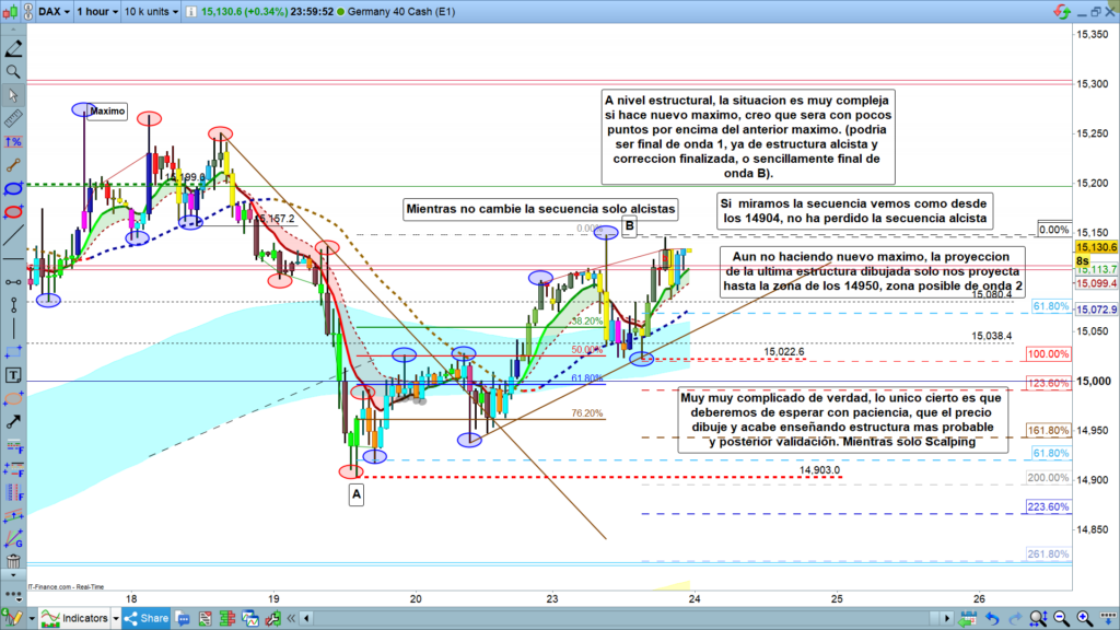 Si el precio hiciera un recorrido hasta la zona 14950, aproximadamente, y después volviera arriba, un nuevo alto por encima del anterior, posiblemente el que aún se tenga que hacer, esto si sería validación estructural mayor e importante, en dirección a los 15550, con primer objetivo y posible nudo de consolidación en la cota histórica 15300.