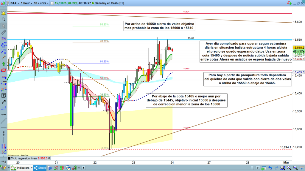 Ya pasamos el día fuerte de la semana en cuanto a datos, y al final volatilidad, y solo algunos activos Dow y euro marcaron recorrido y corrección de nuevo a la zona de inicio. Hoy debería ser el día de validación de tendencias y confirmar el recorrido, esperemos que sea así y lleguemos al fin de semana, con recorridos definidos. Ayer el día fue inoperable, durante la mañana, no solo el Dax, sino todos los activos habían buscado zonas de refugio y a medida que se acercaba la hora de publicación del dato americano las 14,30 h la tensión en el mercado empezó a aumentar, dato malo, peor de lo esperado y los mercados se movieron en volatilidad. El Dax40, subió de la zona de los 15465 hasta los 15550, y vuelta abajo, para de nuevo rebotar y volver a subir hasta la zona de los 15550, de nuevo, pero marcando un máximo más bajo que el anterior.