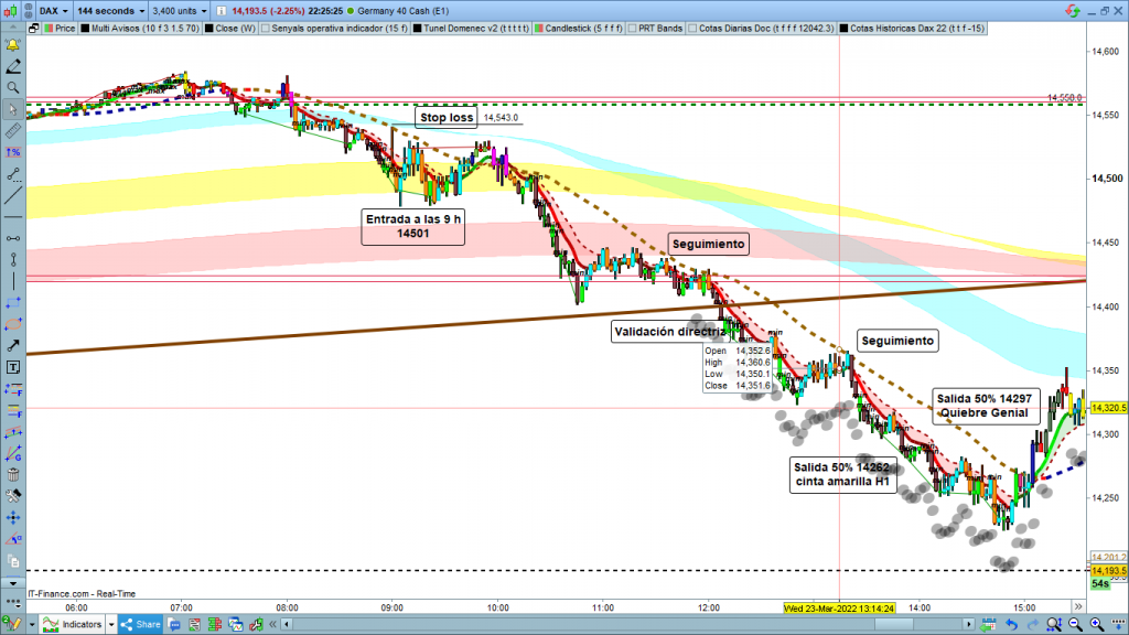 Ayer en el gráfico del día había un post que literalmente decía: «Por debajo de la directriz, alta probabilidad a zona 14100. Atención a cinta amarilla como soporte». Esto, motivó que el take profit del 50% del trade, lo pusiera justo en la cinta amarilla en 14262. Esperaba continuidad, sin embargo, al final ocurrió lo que me temía y la cinta amarilla del túnel Domènec de H1, actuó de fuerte soporte. Como mi operativa había empezado con técnicas de scalping, por patrón de entrada, a la que el precio cerro por encima de la Genial de 144 seg. y la siguiente vela hizo un nuevo alto, automáticamente resto del trade cerrado. en la zona de los 14297. Nueva entrada sobre las 17,45 h, en 14253, Stop loss en 14290, y salida del trade a las 21,03, en 14200, cierre de Wall Street, recordad la diferencia por el cambio de horario en Usa, a horario de verano.
