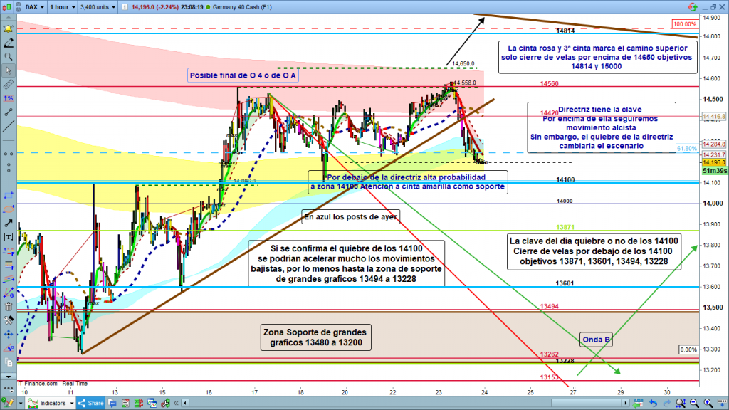 Resumiendo, con un mínimo por debajo de los 14105, consolidación en torno a los 14100, probablemente durante horas. Si entra fuerza, lo normal seria quiebre de la cota histórica 14100, y recorrido bajista importante, con posibles paradas y rebotes en las diferentes cotas históricas, que actuaran de soportes. El objetivo de alta probabilidad, sería la zona de soporte de grandes gráficos en 13494 a 13228. Para el día de hoy no creo que el recorrido sea más importante. Muchísima suerte y muy buenos trades.