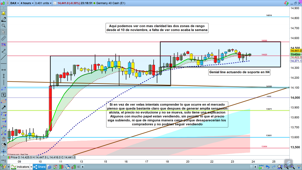 En gráfico de 4 horas del dax40, creo que sobran las palabras, resulta que de repente se genera gran sentimiento alcista, y luego llevamos ya 12 días que no se mueve, ni sigue subiendo, ni se gira ni baja, además, fijaros que se mantiene perfectamente por encima de la Genial line de 4 horas.