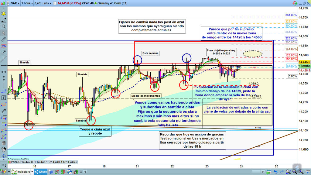 La zona de máximo esperada para hoy, a conseguir muy probablemente, durante sesión asiática y sesión europea, la zona de los 14500 a 14525. y posterior movimiento de bajada en lateral.