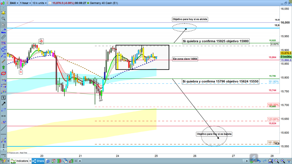 En gráfico de 1 hora del dax40, situación exactamente igual a la de ayer a esta hora, el día de ayer fue completamente neutro, el precio se movió en un rango muy pequeño con eje en la cota histórica 15864. El mínimo del día, fue exactamente la apertura semanal, en la zona 15829, y el máximo del día en los 15919, justo después de la apertura americana.