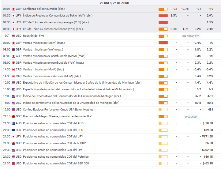 Publicado viernes 25 de abril de 2025, a las 00 h UTC. Las horas del Calendario Económico, son UTC+2.