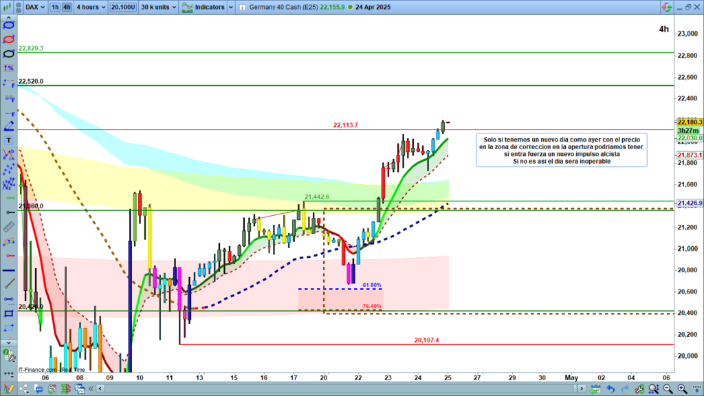Análisis diario Dax, tipo flash corto, lectura de 2 a 4 minutos, con las claves del día. Ondas de Elliot, estructuras de precio, zonas clave y objetivos.