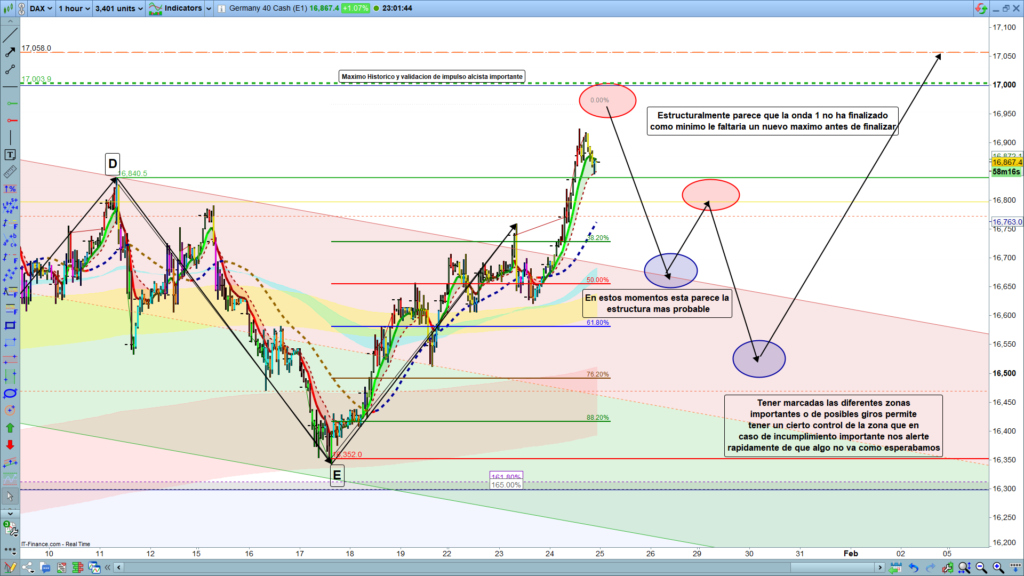 El precio, en los movimientos del día de ayer, validó claramente por encima de la zona reseñada, 16840, con lo que la estructura más probable en curso, nunca se puede acabar de afirmar al 100%, es en estos momentos, que estemos en la onda 1, de un gran impulso alcista. Obviamente, la validación clara de esta posibilidad será con la consecución de un nuevo máximo histórico por encima de los 17003.