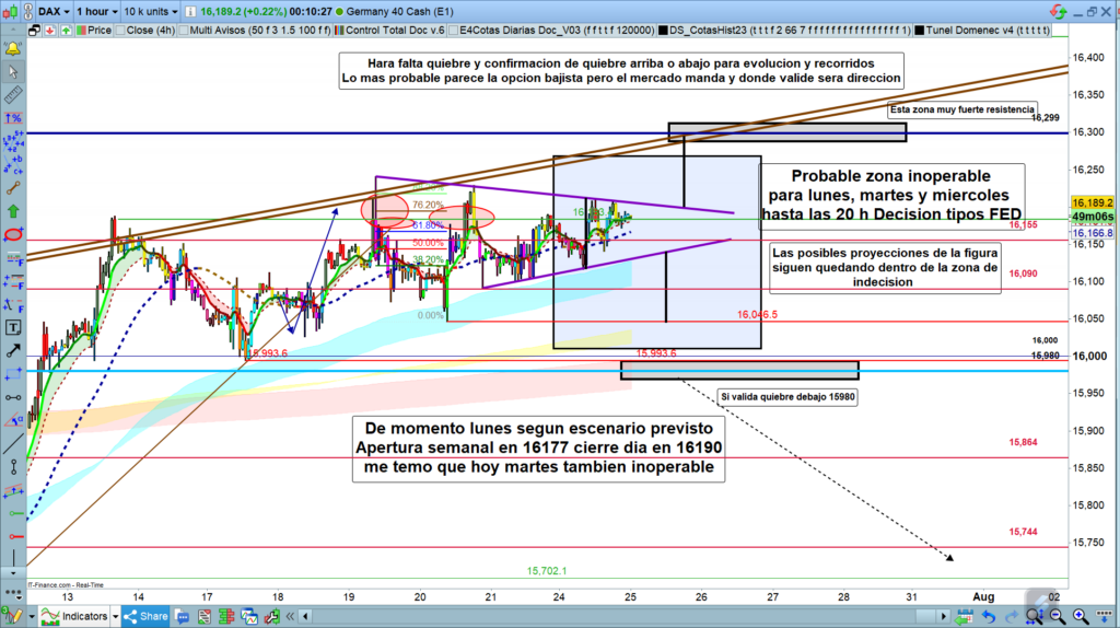 Mientras el precio se mantenga por encima de los, 16155, nada de entradas bajistas sin validaciones claras. Fijaros que el precio sigue manteniendo, de momento, secuencia de máximos más bajos y mínimos más altos, con lo que estamos dentro de una figura, solo el quiebre de alguna de sus directrices nos proporcionara proyección y validación.