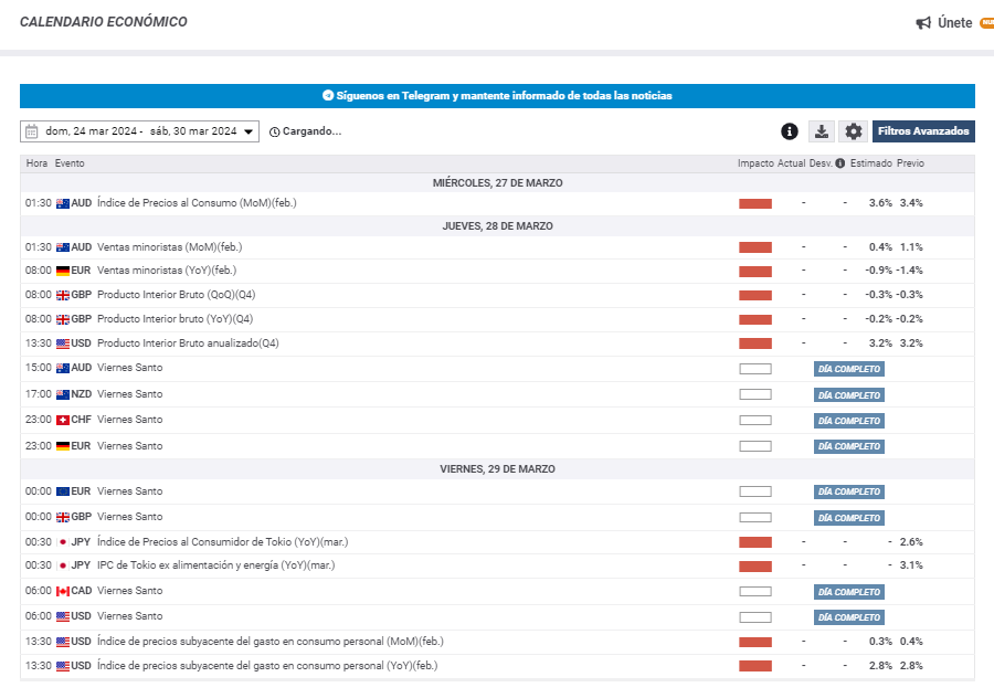 Publicado lunes 25 de marzo de 2024, a las 00 h UTC. Las horas del Calendario Económico, son UTC+2.