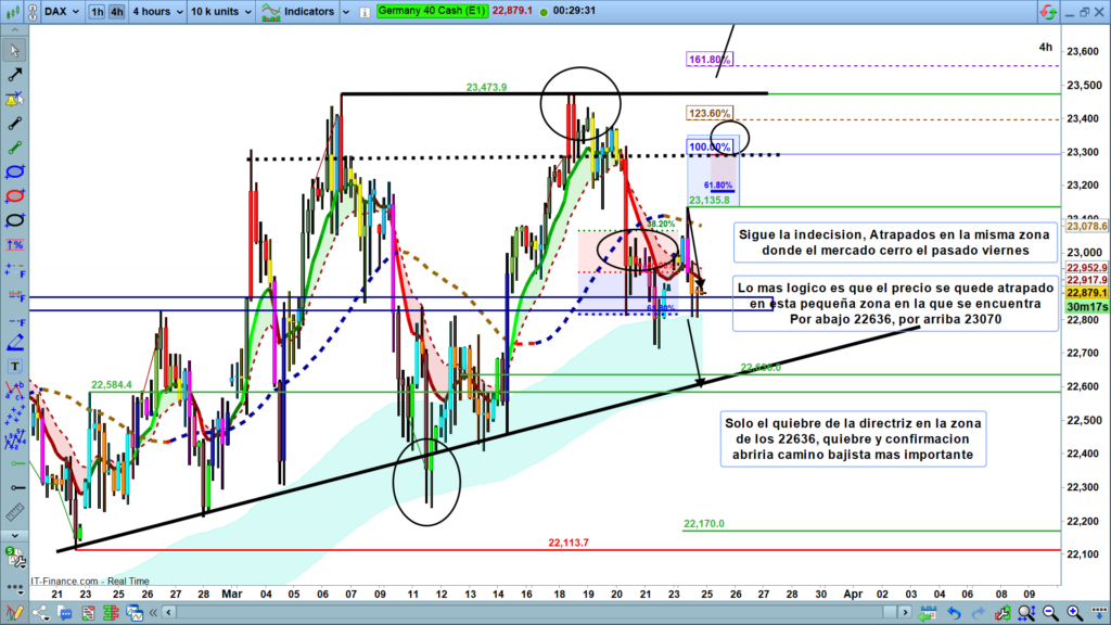 El DAX 40 continúa en una fase de indecisión, oscilando en la misma zona donde cerró el pasado viernes. El precio se encuentra atrapado en un rango delimitado por 22.636 en la parte baja y 23.070 en la parte alta, lo que sugiere un período de consolidación mientras el mercado define su próxima dirección.