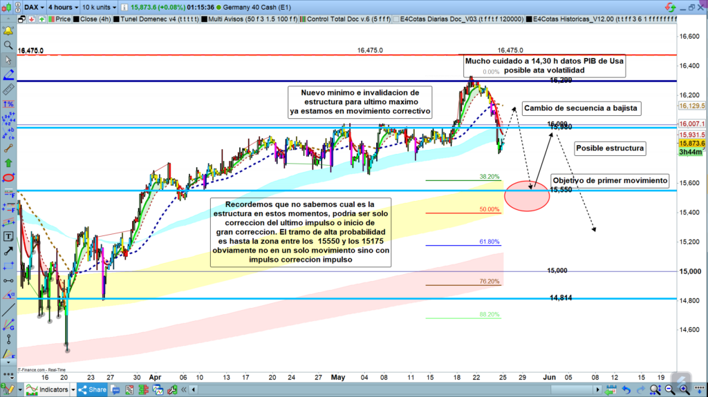 Parece que la estructura de ayer podría haber completado la primera parte de esta estructura inicial, y que, por tanto, lo siguiente sea la corrección comentada, cuyo objetivo final, en principio hasta la zona de los, 16000 a 16100, con la cota histórica 16090, puede depender de los posibles movimientos que se puedan generar con el dato de las 14:30 h, tanto para llegar más arriba como para girar bruscamente de nuevo en situación bajista antes de llegar a esta zona alta. Muchísima suerte y muy buenos trades.
