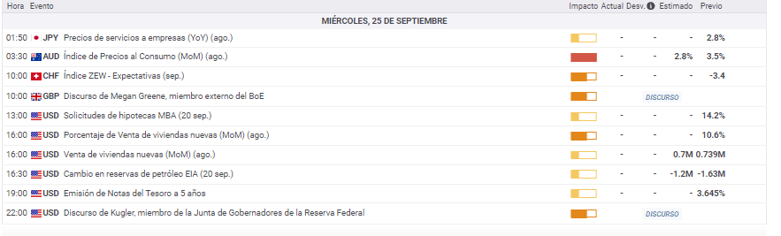 Publicado miércoles 25 de septiembre de 2024, a las 00 h UTC. Las horas del Calendario Económico, son UTC+2.