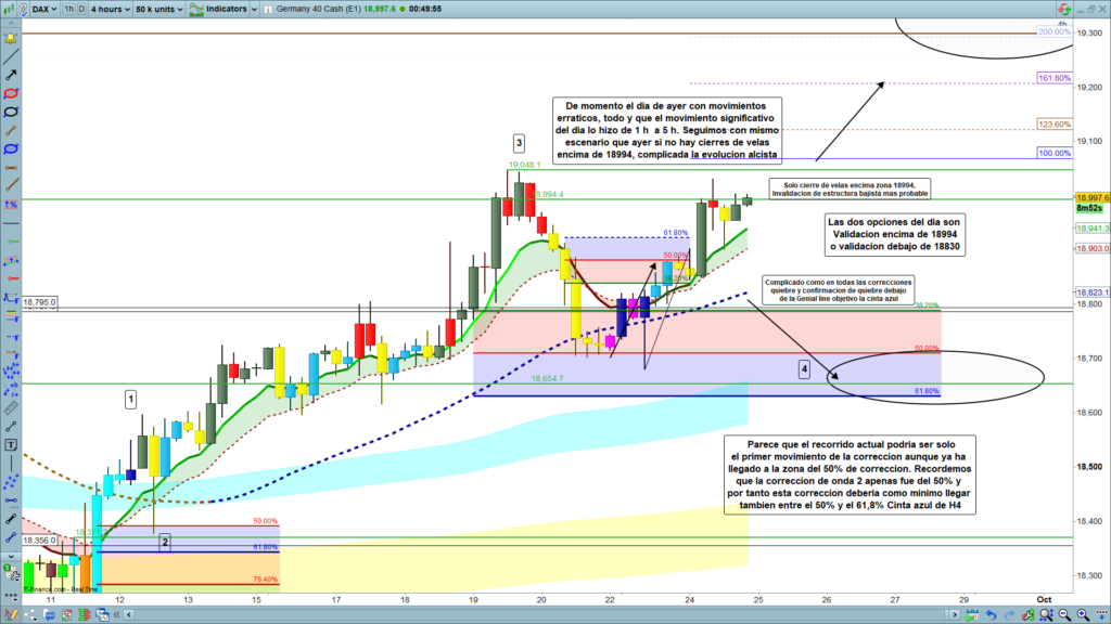 Por la parte inferior, a estas horas parece mucho más complicado, ya que solo tendríamos posibilidad de operativa por debajo de la Genial line en la zona de los 18830, pero el problema es que antes de llegar a ella tenemos múltiples zonas de fuertes soportes en varias temporalidades. Con lo que los movimientos hasta esta zona podrían ser muy erráticos y claramente inoperables. Además, solo el quiebre y confirmación de quiebre debajo de la Genial nos abriría un recorrido limpio y relativamente fácil hasta la cinta azul de H4 en los, 16650.