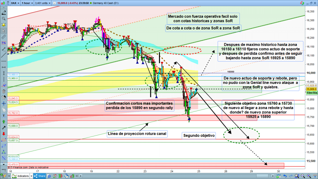 Después de máximo histórico, caída hasta zona 16150 a 16110, actuó de soporte, rebote hasta Genial y de nuevo ataque y quiebre a zona 16150 a 16110. Una vez perdida la zona siguiente objetivo a zona 15925 a 15890, de nuevo misma situación. Actuando de soporte y rebote de nuevo hasta Genial. Parece que el recorrido por debajo de 15925, por mi esperado, fue lo que luego no permitió la estructura de confirmación de quiebre de canal volviendo de nuevo a la zona 16110 a testear directriz inferior. Seguimos Genial actuando de resistencia y nuevo ataque a zona 15925 a 15890, al segundo ataque, igual que las zonas anteriores, quiebre y hasta siguiente zona, 15760 a 15730. actuando de soporte de nuevo y rebote. En esta ocasión al ser la caída con mucha fuerza, el rebote volvió hasta zona SoR anterior 15925 a 15890, sin testear la Genial de H1. Por tanto, al finalizar el día, el precio está en zona de importante indecisión. Por arriba mucha atención a la Genial, por abajo de nuevo la perdida de la zona S0R, debajo de los 15890, debería reiniciar rally bajista.