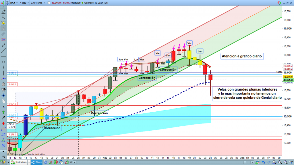 En gráfico diario del dax40, atención al detalle. Tanto anteayer como ayer, velas de claro componente bajista, pero al llegar a la zona de Genial line de diario, rebote y gran pluma inferior, sin ningún cierre por debajo como inicio de quiebre de la Genial, y lo que supondría un cambio de tendencia ya de cierta entidad. Mientras no tengamos un quiebre confirmado de esta zona. Difícil la evolución bajista. Si confirma él quiebre de esta zona, el objetivo el marcado por mis análisis. La zona de los 15624 a 15500 a 15470. Si no pudiera con ella el objetivo sería la zona de corrección ahora en 16068, y su quiebre nos llevaría primero a la zona 16150 a 16110, y posteriormente si quiebra los 16150 a la zona 16240. Veamos ahora el detalle en el gráfico de 1 hora.